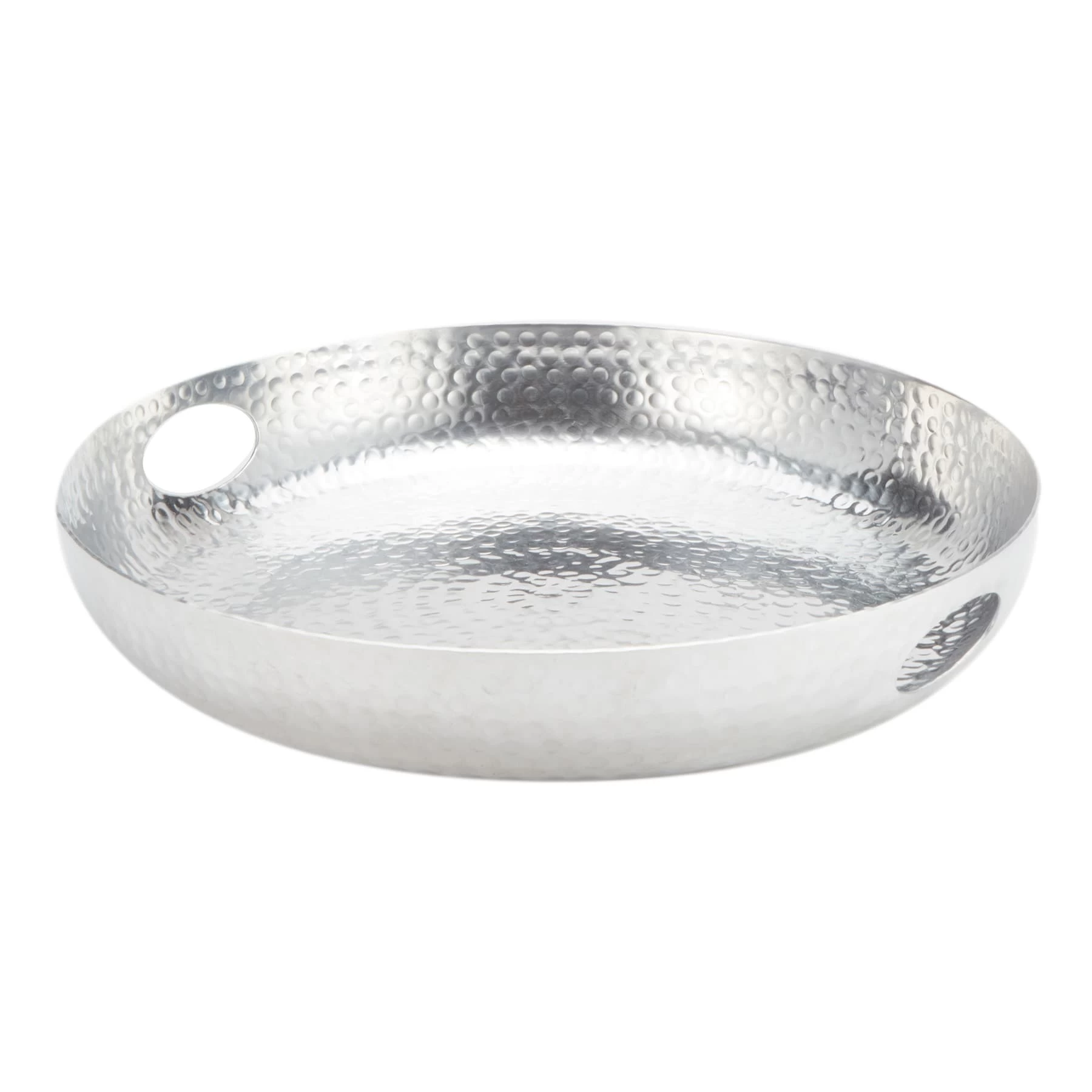 This 16″ round beverage / serving tray from American Metalcraft is perfect for any gathering from brunch buffets to a private table service for two. This tray features a beautiful hammered finish and two handles.