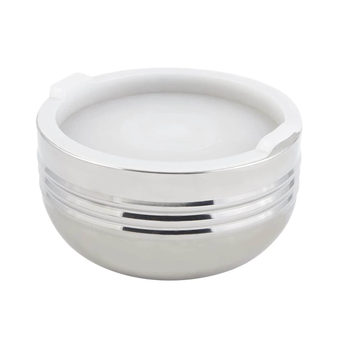 This Cold Wave 2 Qt. bowl is made of stainless steel and has the patented three‐wall design that features a 1/4″ outer space that is filled with air and the 1/4″ inner space that is filled with an insulating gel. After pre‐freezing, it will keep food cold for 8 hours at ambient temperature without sweating. This bowl also includes a stackable plastic cover.