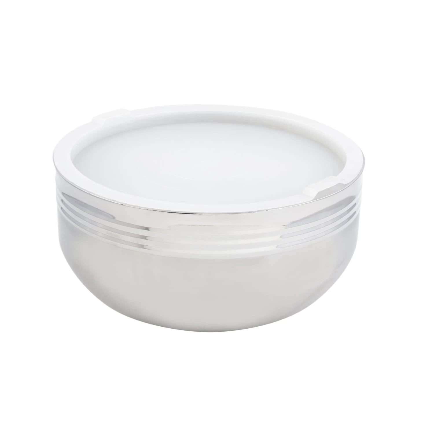 This large 10.1 Qt. bowl features the exclusive, patented three‐wall design of the Cold Wave line. The outer layer contains air and the inner layer that contains insulating gel. After pre‐freezing, it will keep food cold for 8 hours at ambient temperature without sweating. This bowl also includes a stackable plastic cover.