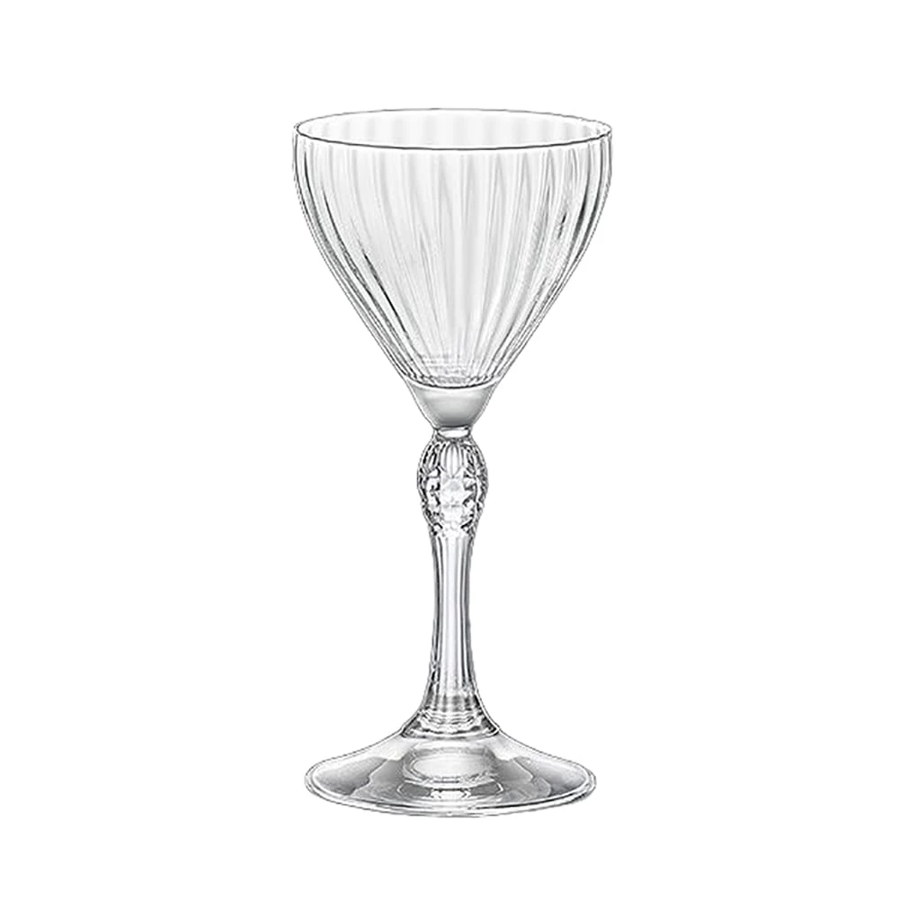 This Nick & Nora glass is part of the America ’20s Collection from Bormioli Rocco.These 1920s-inspired glasses bring the glamour of trendy American jazz bars through to today. Where conversation was about art and the ambiance was of unprecedented newness and enthusiasm. All the products are characterised by an elegant and original vintage style, in line with the latest trends, and are embellished with dense facets that develop precious light effects, enhancing the colors of cocktails and drinks.