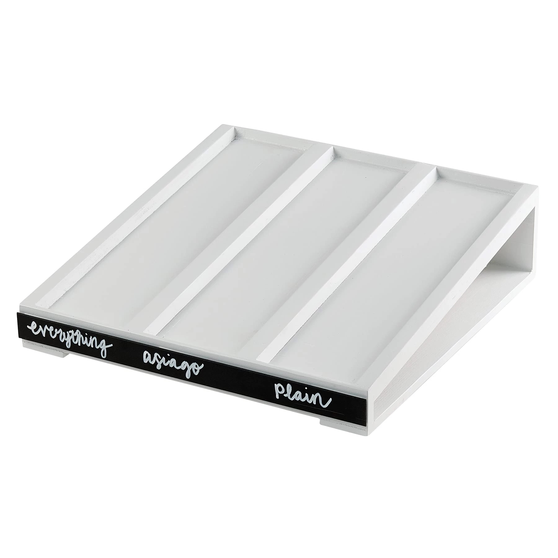 Display delicious bagels with this Write‐On Angled Bagel Display from Cal‐Mil. The perfectly angled bagel holder base allows for the great visualization into the potential selections for a guest. The chalkboard front allows for easy labeling so customers know all of their options.