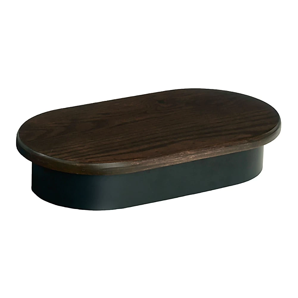 Create a dynamic accent to any presentation with these Heritage Oval Risers featuring a dark brown oak top and black metal base. The modern color blocking feature creates a trend-forward display to help showcase pastries, signage, treats, and more!