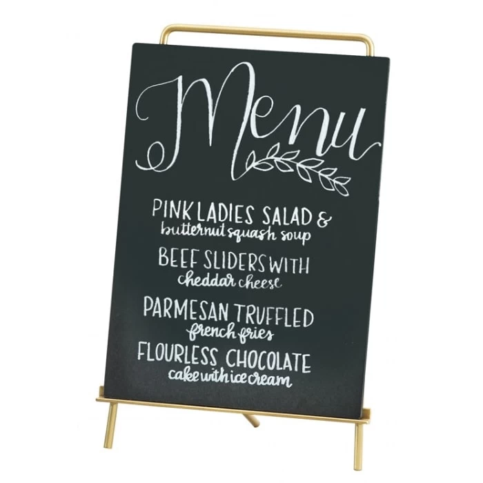 Use the Mid‐Century sign holder to display food or drink menu items. This sign holder comes in two pieces, the brass frame and the chalkboard sign. To clean, simply wipe the sign with a damp rag and write again&ex cl;