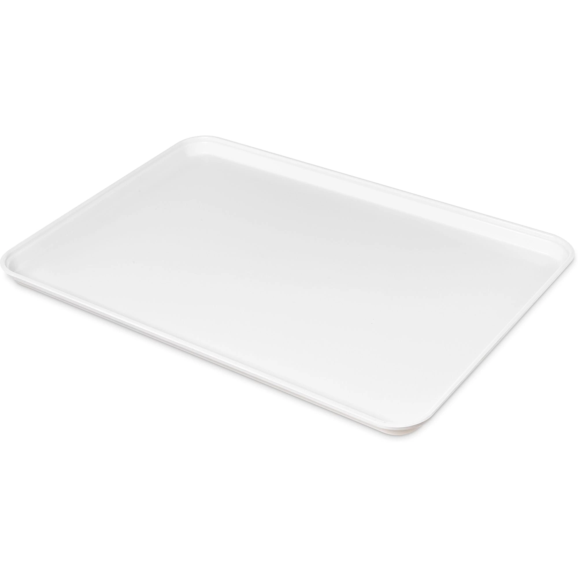 This rectangular fiberglass market tray from Carlisle® features a pearl white color and is perfect for displaying baked goods, breads and sliced deli meat. The heavy‐duty fiberglass construction eliminates warping which makes this tray very durable and is perfect for use in bakeries, markets or catered events. This tray is dishwasher safe and the air‐flow corners reduce drying time.