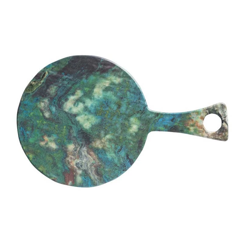 This Lapis parrot wing round board from Cheforward has a beautiful, green marbled look with the durability of melamine. This board adds color and style to your table.