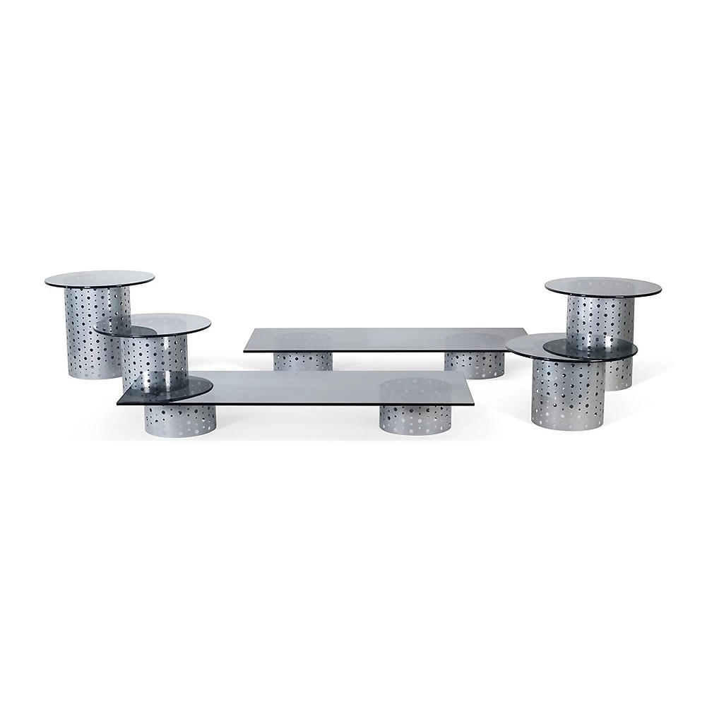 Add a modern look to your culinary display with this Dots Silver and Smoke Glass Display Set from Front Of The House. Perfect for buffets or catered events!