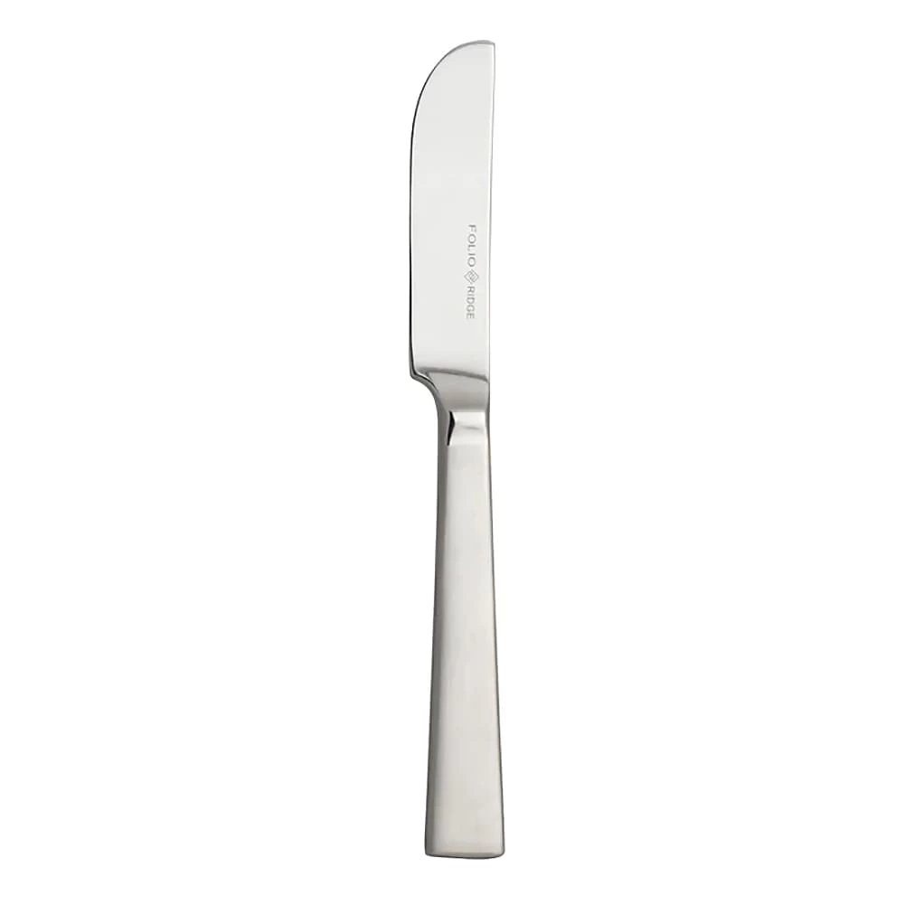This 6-3/4″ butter knife is part of the Ridge Flatware Collection by Folio and features a classic design with a unique arch at the base of the tines and beautifully brushed satin finish handles.