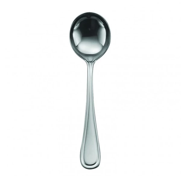 This graceful soup spoon from the Oneida New Rim II line has graceful lines that gives it a simple elegance. The durable 18/0 stainless steel craftsmanship will complement a variety of dining presentations.