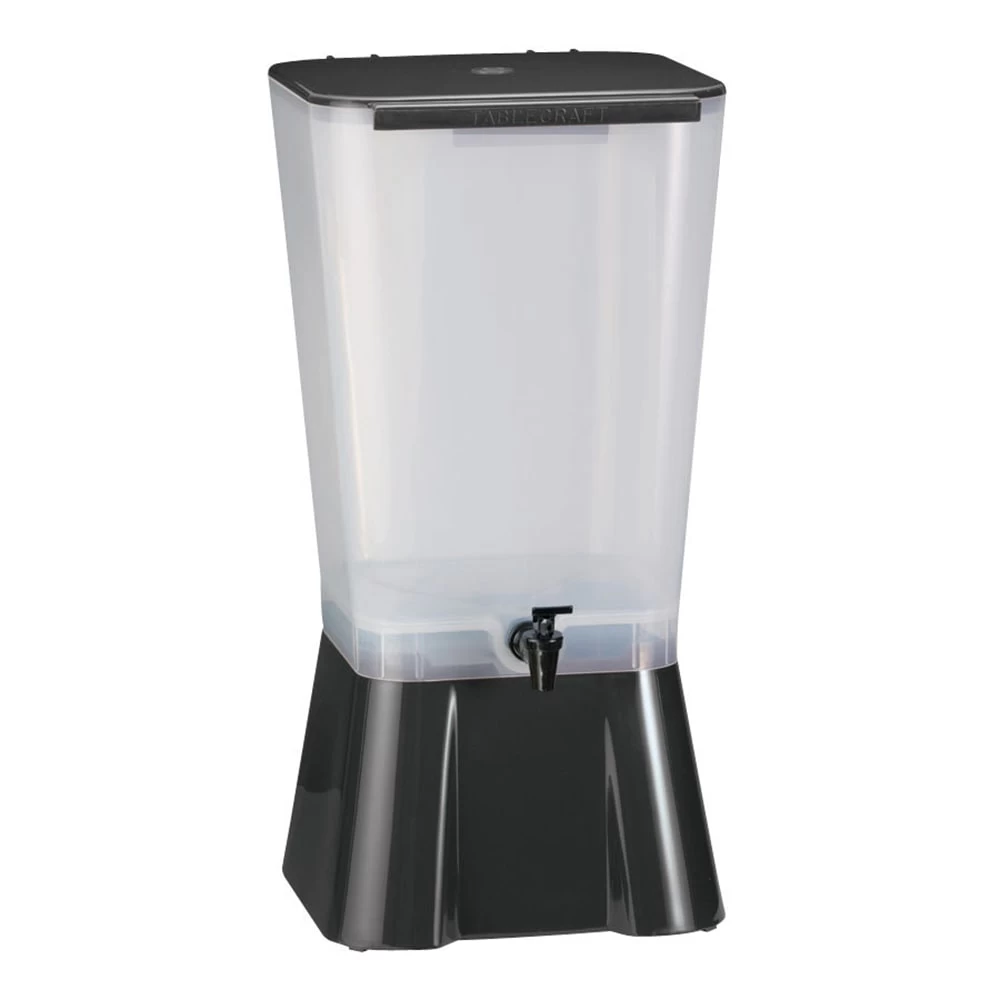 This TableCraft 5 gallon black and white plastic beverage dispenser comes with graduated on the side of the reservoir. It also comes with a Tomlinson Faucet.