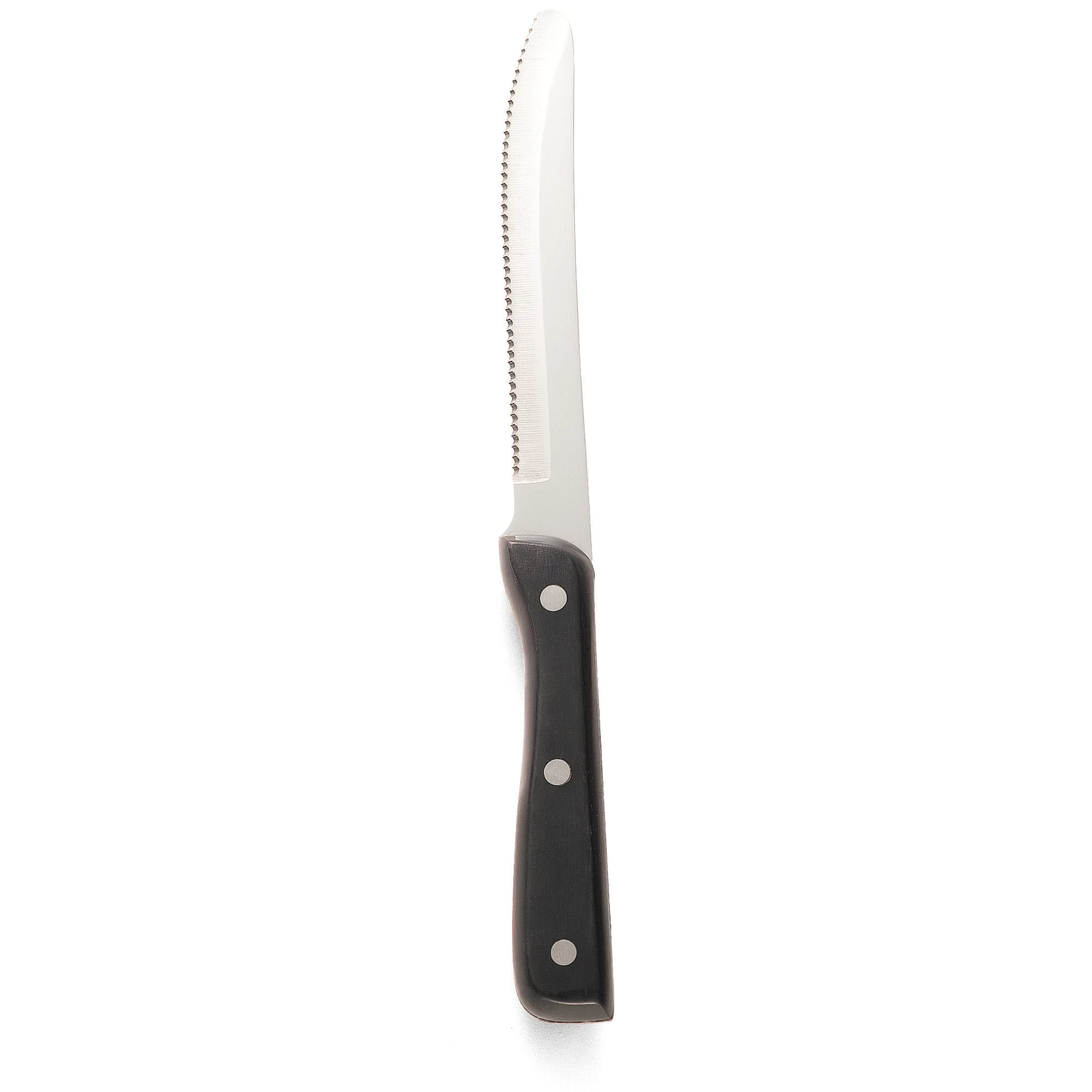 This heavy duty stainless steel knife features a black Delrin handle with a round tip. The handle is curved for a better grip and easier use.