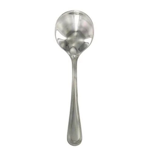 This 6″ bouillon spoon features the teardrop‐shaped handle and narrow, double border lines of the Medium Weight Geneva pattern.