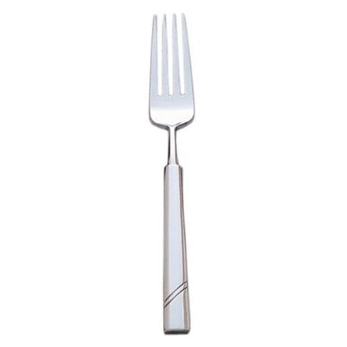 This 8‐1/8″ dinner fork features the lightly tapered cylindrical handle and two embossed diagonal pinstripes of the Zephyr pattern in high‐quality stainless steel.